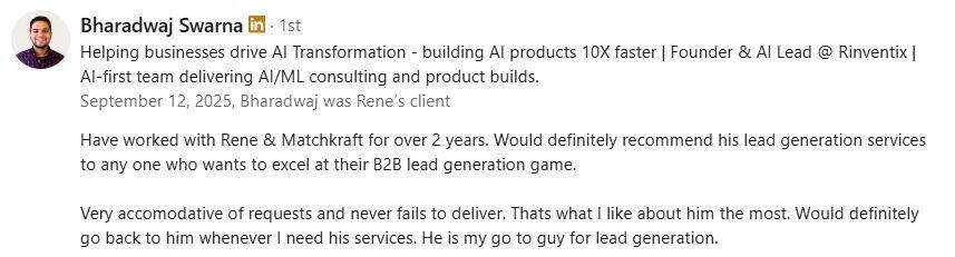 We combine our proprietary B2B email finder engine, Matchkraft, with advanced scraping techniques. By tapping into sources like Apollo, ZoomInfo, Lusha, and Sales Navigator, we enrich and cross-verify data—delivering complete, accurate, and reliable results.